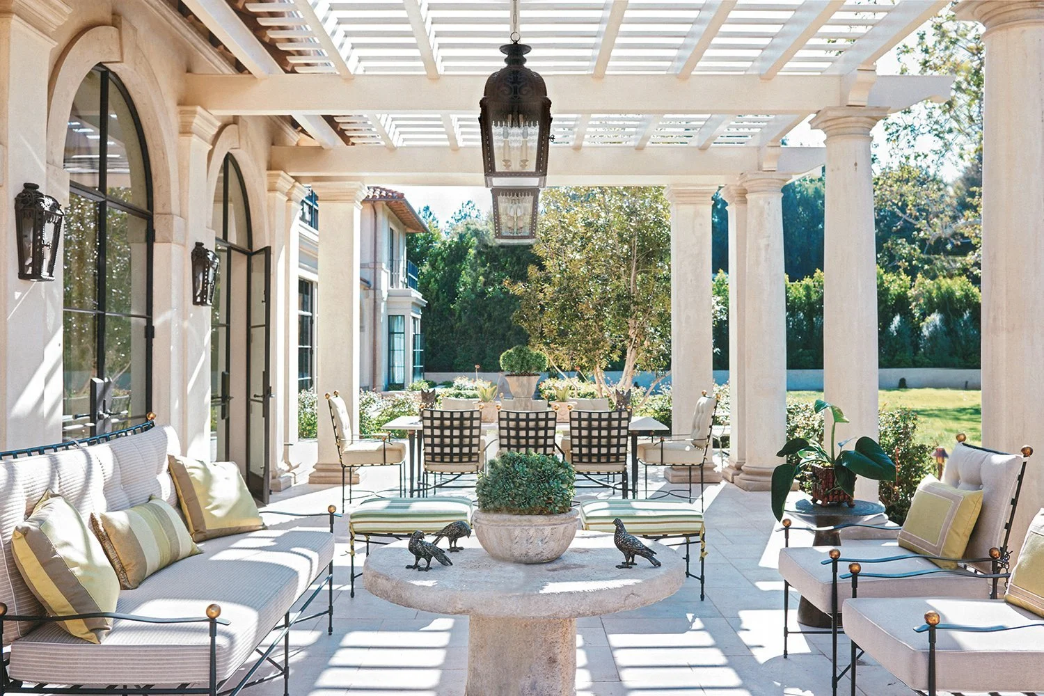 The architecture for this new Bel Air, California home was inspired by the villas of Northern Italy. The house rose on the site of the owner’s previous residence, but they wanted a new house where their now larger family could all gather and entertain. This new residence was built around an interior courtyard fashioned as a columned cloister with a central fountain. The architects created a graciously proportioned home suitable to the site which is an unusually flat property. The house unfolds along the central axis from the front entrance, through the cloister, living room and rear loggia and all the way to the pool house loggia.