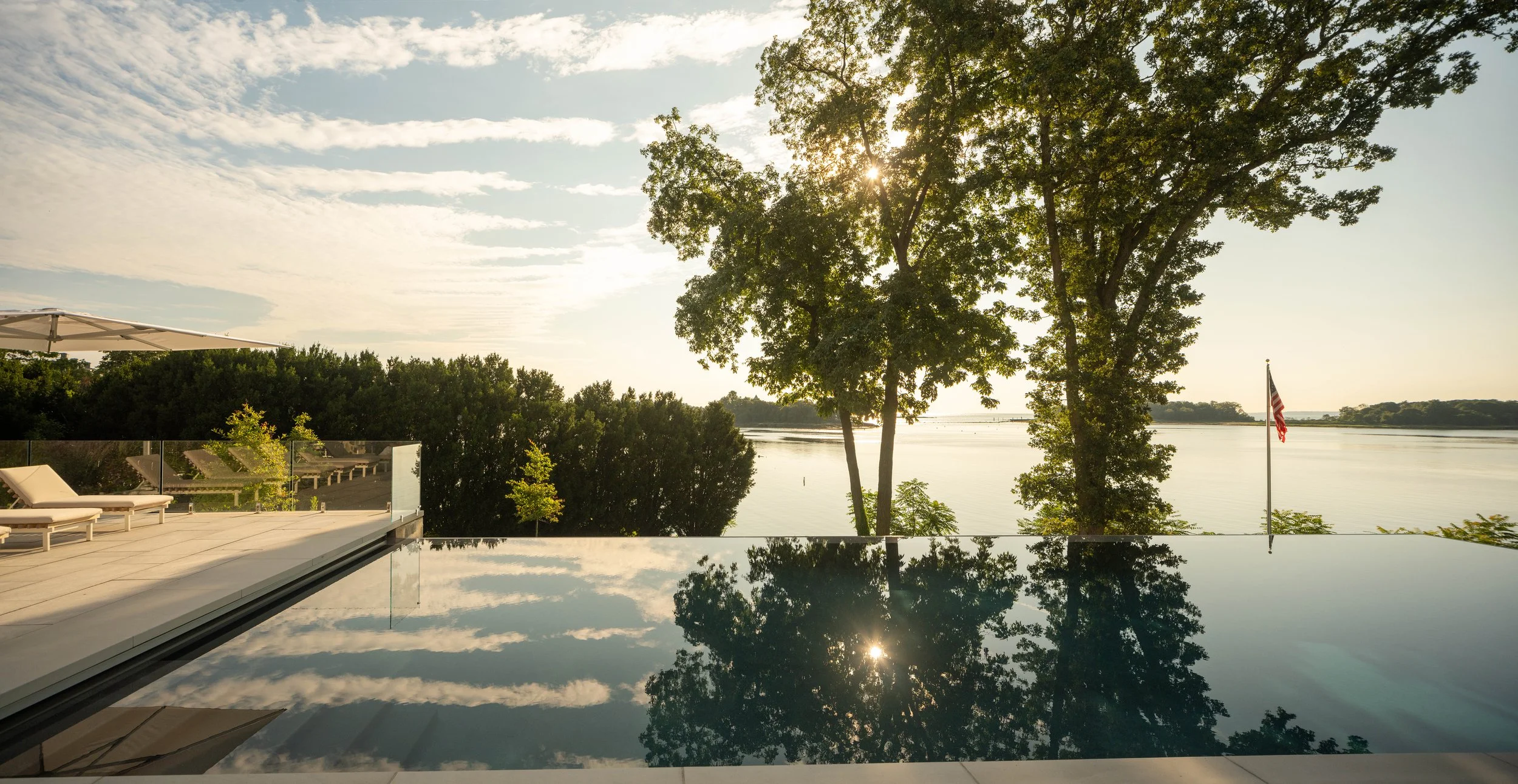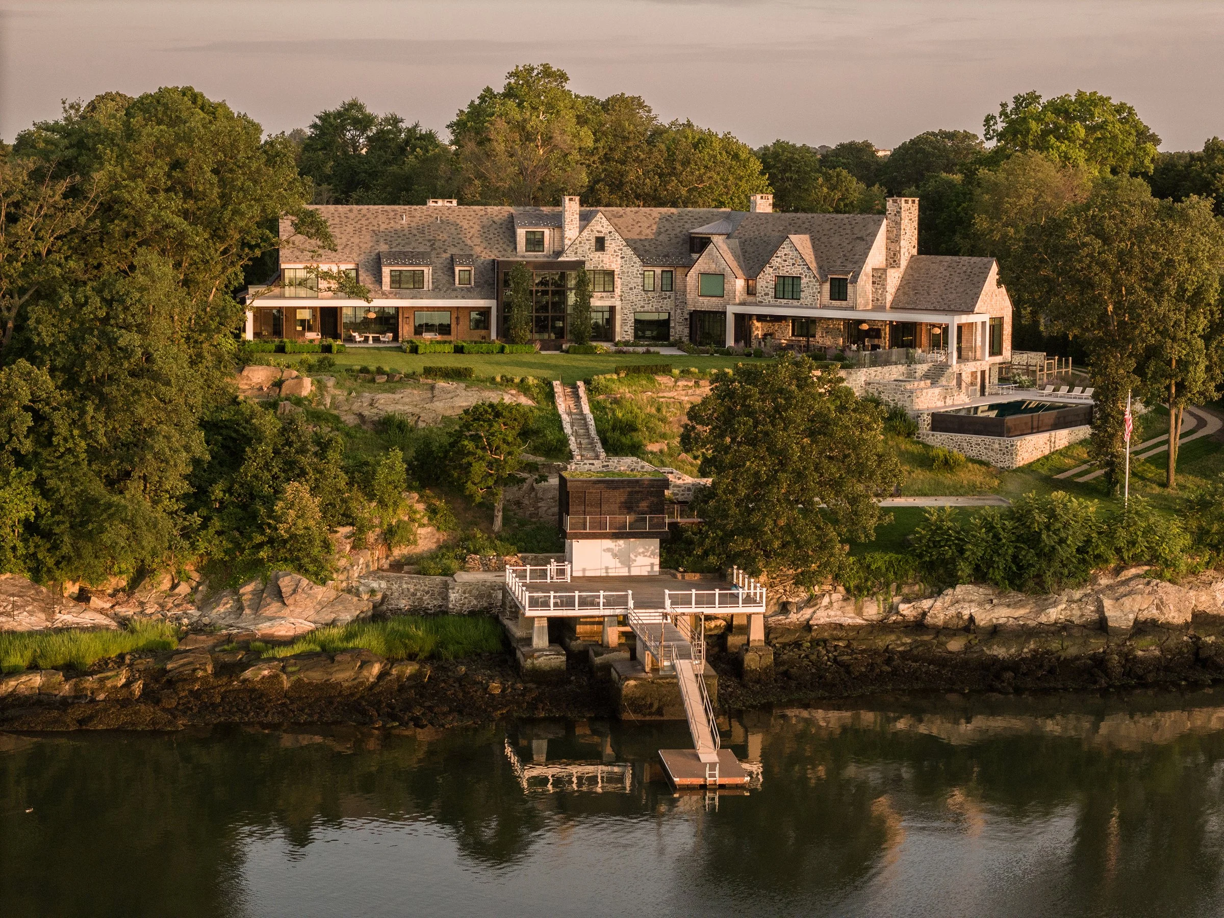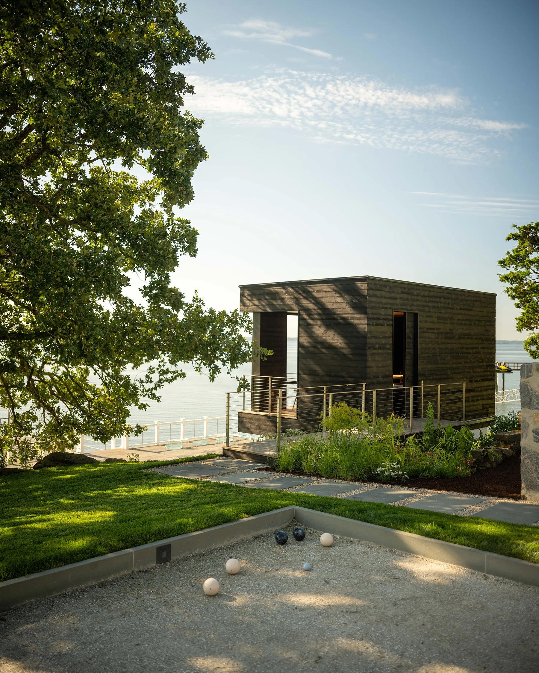 With sweeping views across the Long Island Sound and more than 250 feet of direct waterfront, this landscape was designed as a seamless extension of the home—shaping arrival, movement, and daily life around a continuous dialogue with the water. A procession of hornbeam hedges, preserved stone ledge, and fastigiate oaks leads to a main courtyard, while mirrored water features and tall glass facades strengthen the connection between interior and exterior. At the rear, boxwood parterres, seasonal perennials, and a vanishing-edge pool align the terraces with the horizon, as light gray porcelain and sandstone walkways soften the transition between garden and architecture. Along the shoreline, native maritime plantings stabilize the ledge and create habitat, while a main lawn, restored stone stair, bocce court, and waterside cabana extend the experience toward the water—forming a landscape defined by layered planting, spatial clarity, and a quiet sense of purpose.