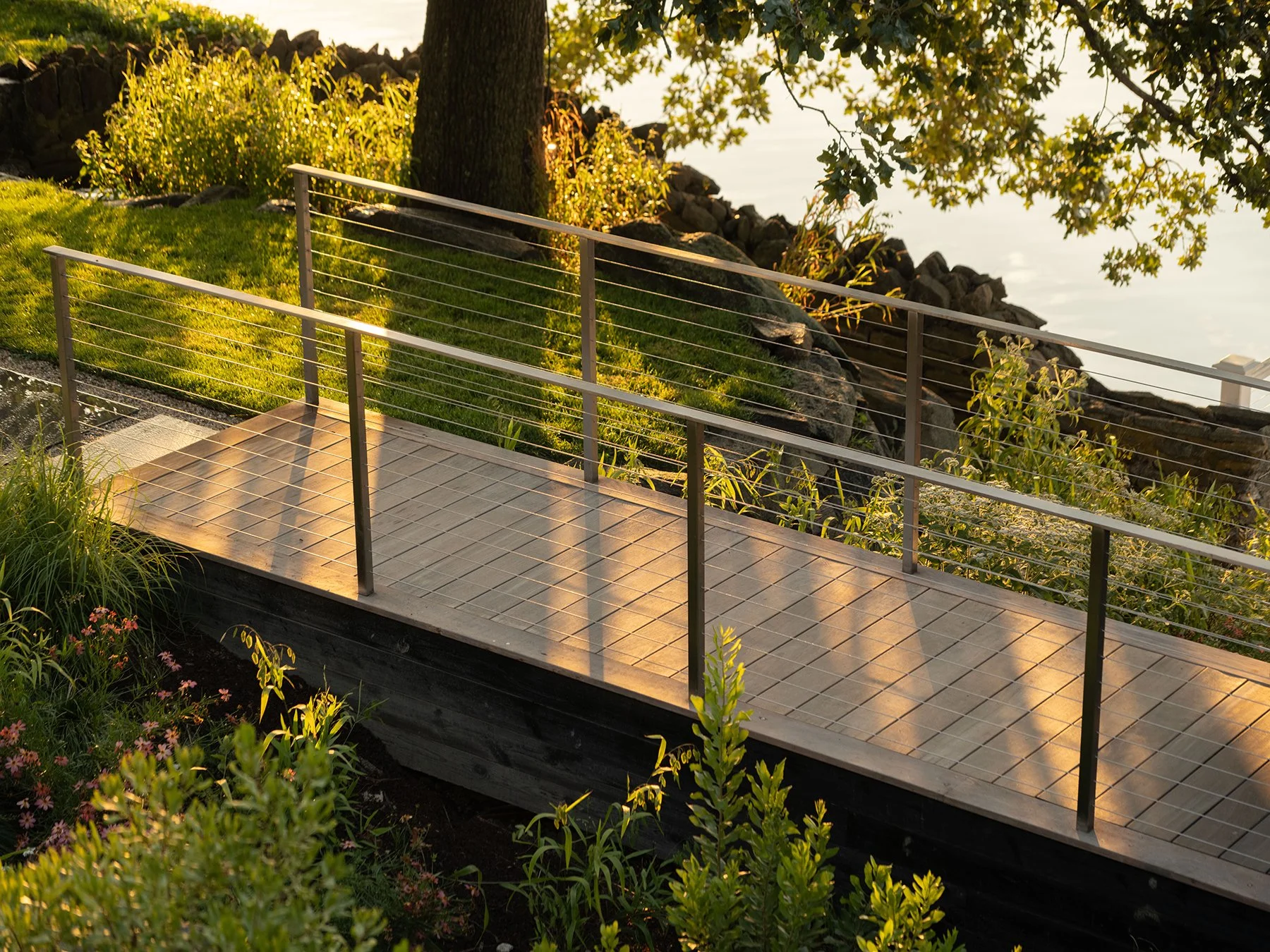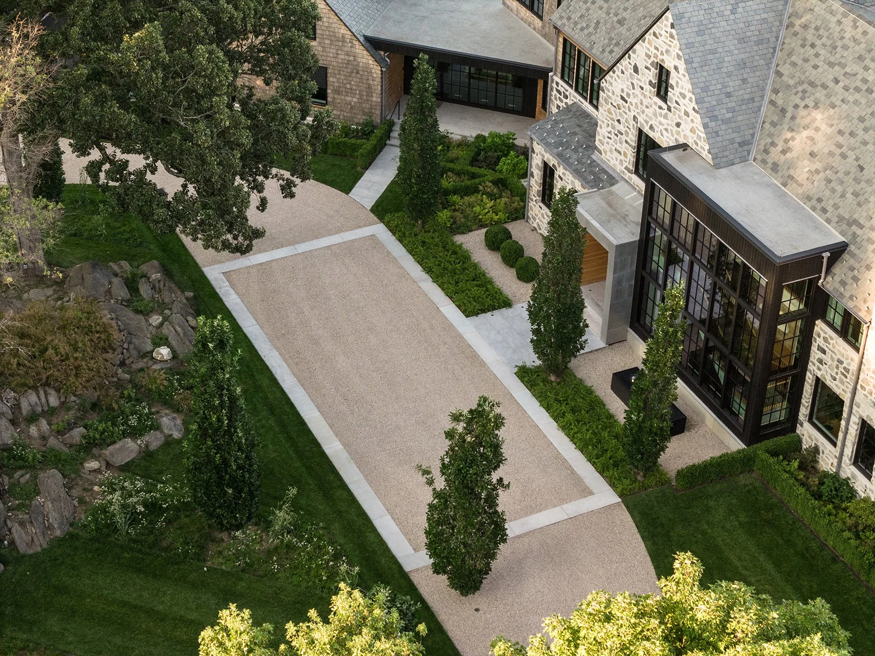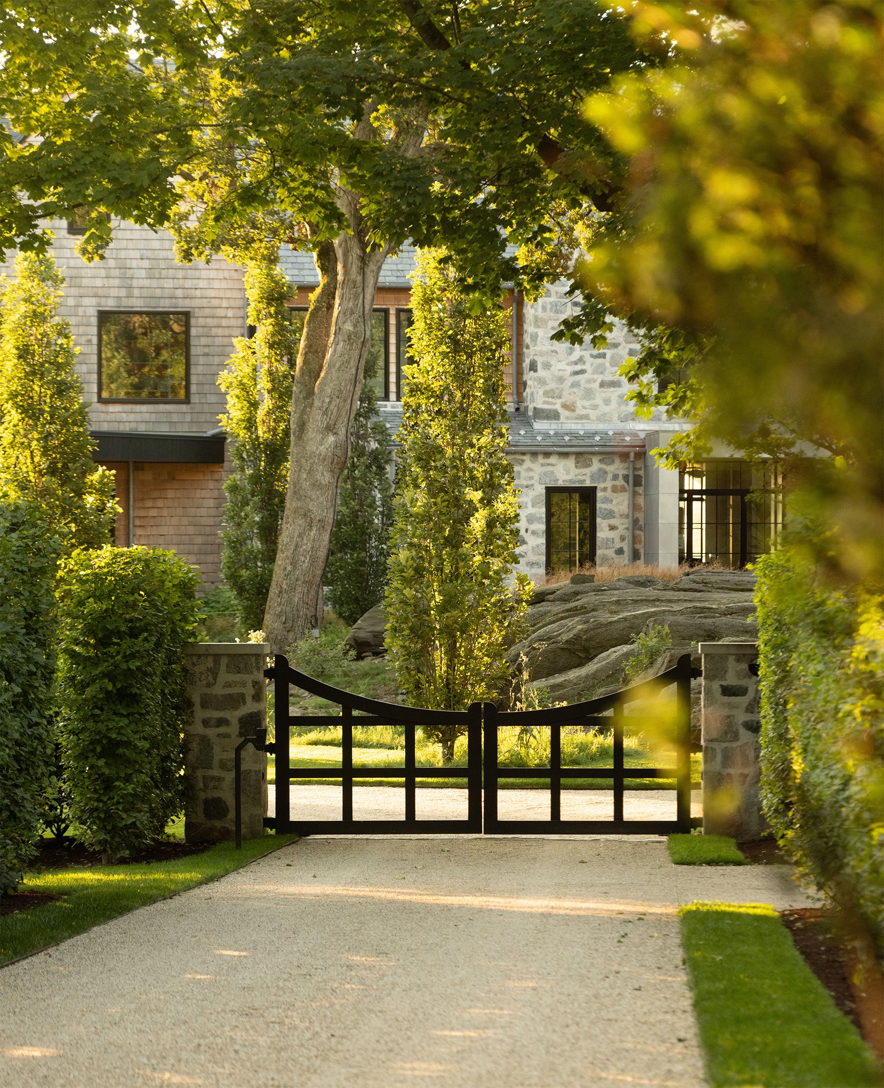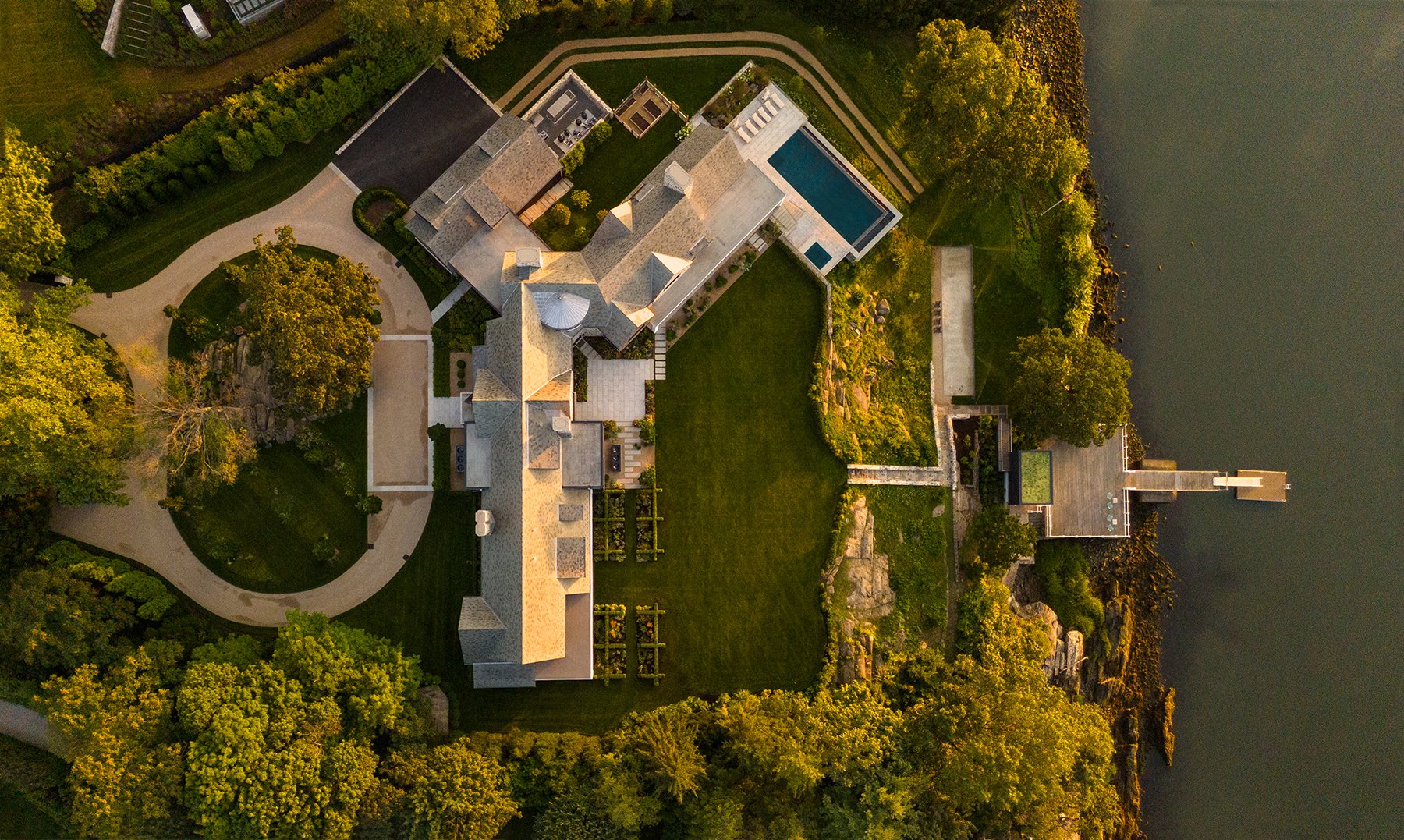 With sweeping views across the Long Island Sound and more than 250 feet of direct waterfront, this landscape was designed as a seamless extension of the home—shaping arrival, movement, and daily life around a continuous dialogue with the water. A procession of hornbeam hedges, preserved stone ledge, and fastigiate oaks leads to a main courtyard, while mirrored water features and tall glass facades strengthen the connection between interior and exterior. At the rear, boxwood parterres, seasonal perennials, and a vanishing-edge pool align the terraces with the horizon, as light gray porcelain and sandstone walkways soften the transition between garden and architecture. Along the shoreline, native maritime plantings stabilize the ledge and create habitat, while a main lawn, restored stone stair, bocce court, and waterside cabana extend the experience toward the water—forming a landscape defined by layered planting, spatial clarity, and a quiet sense of purpose.