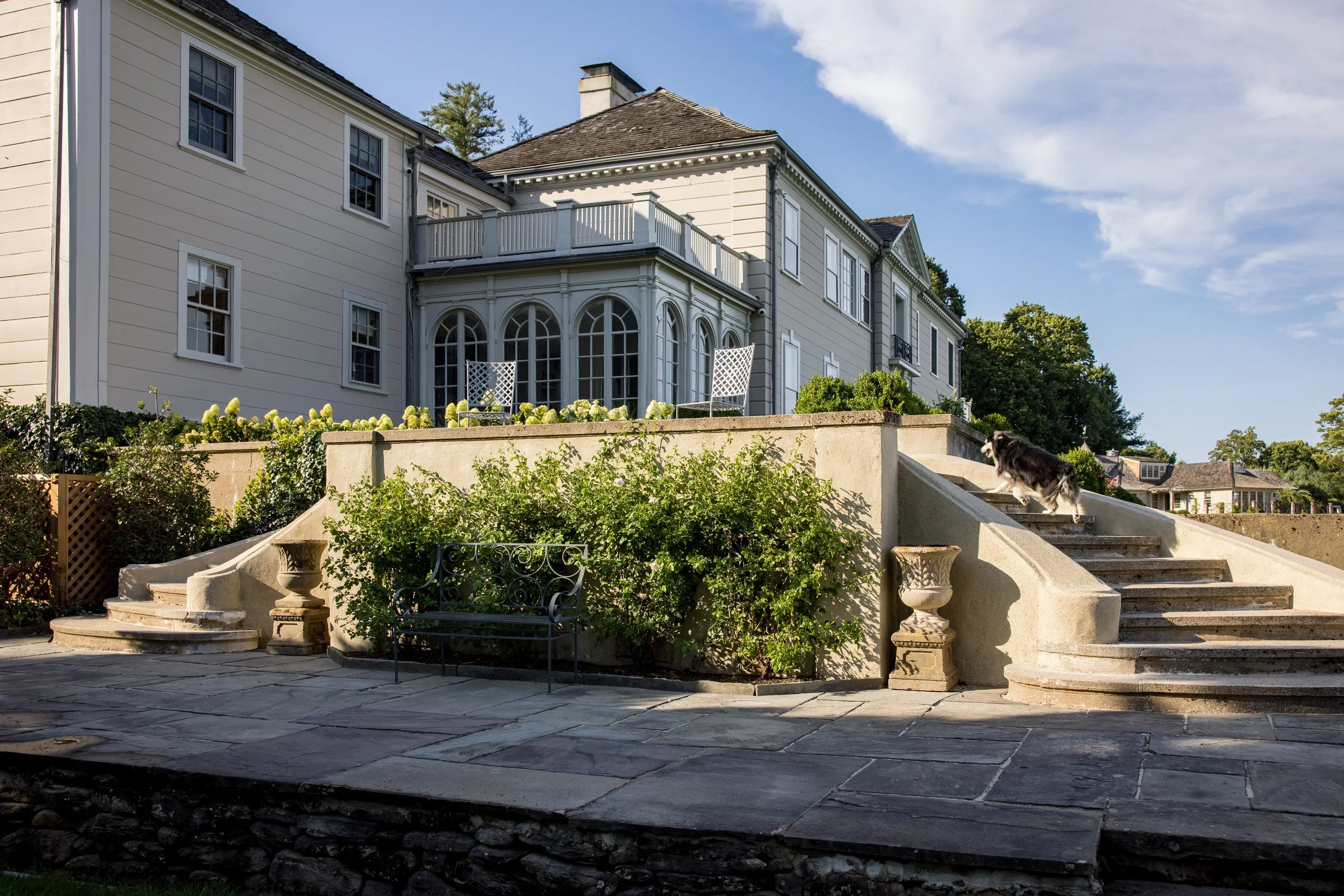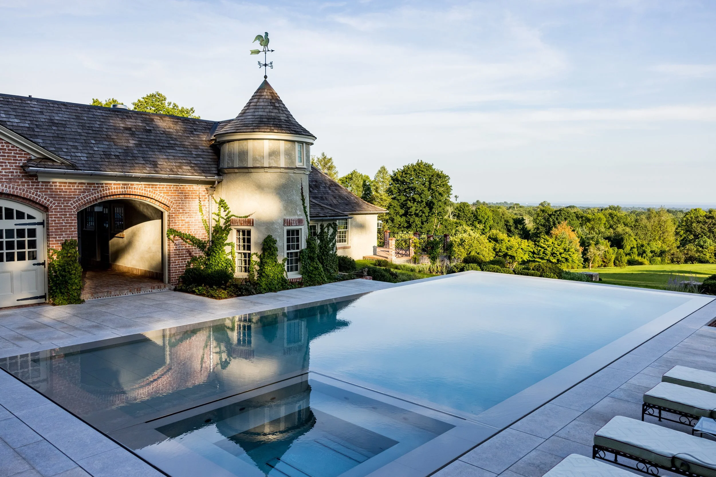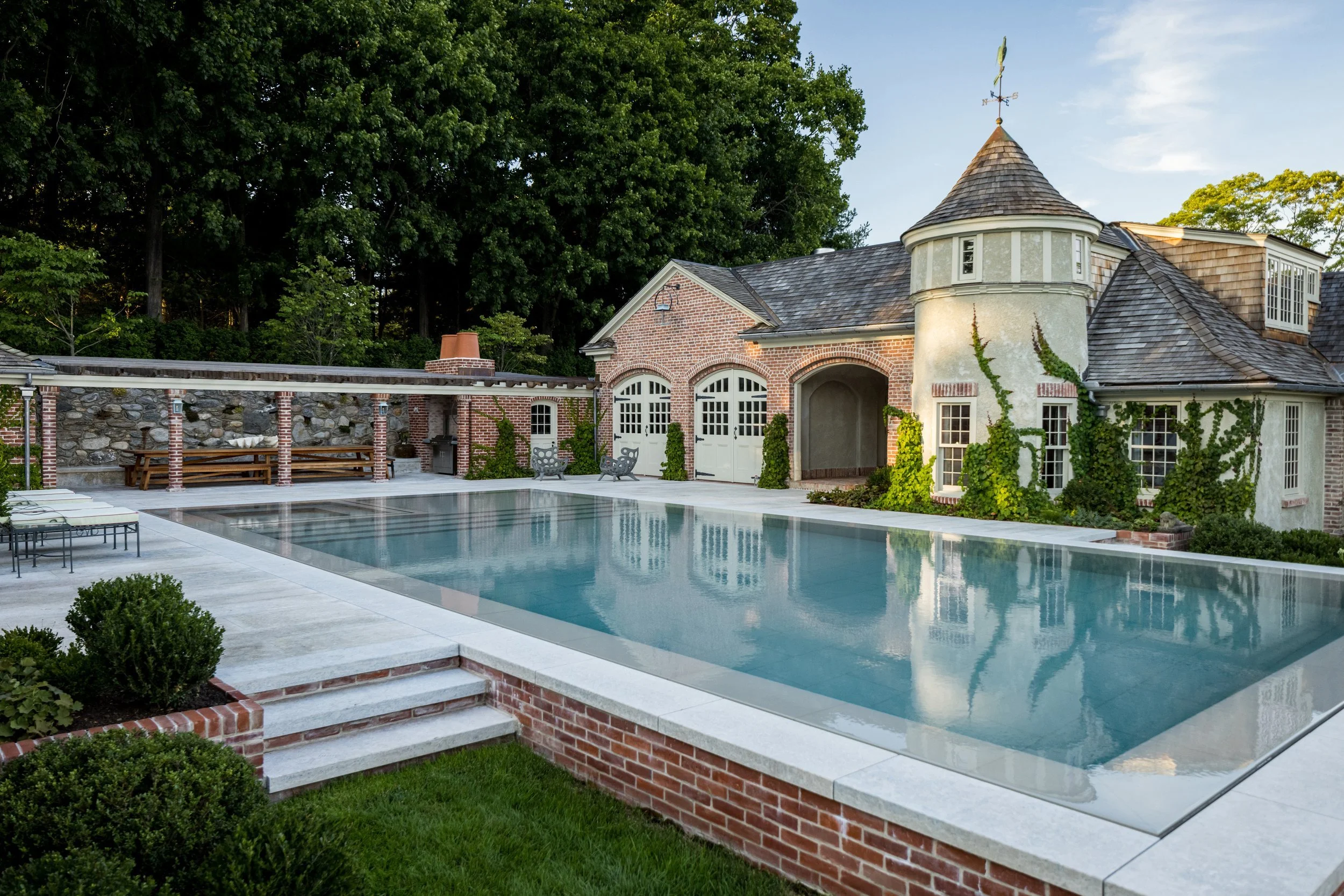 Perched atop the highest point in the historic Greenfield Hills village of northern Fairfield, Connecticut, stands a circa 1927 estate showcasing exquisite French Manor Colonial architecture, envisioned initially by local architect Cameron Clark. However, over the years, the charm of the cottage and carriage house became obscured and disconnected by driveways, a swimming pool, and a pool cabana. Collaborating closely with the homeowners, current architect, and a skilled team of craftsmen, we embarked on a journey to reimagine the landscape, revealing fresh perspectives and focal points.