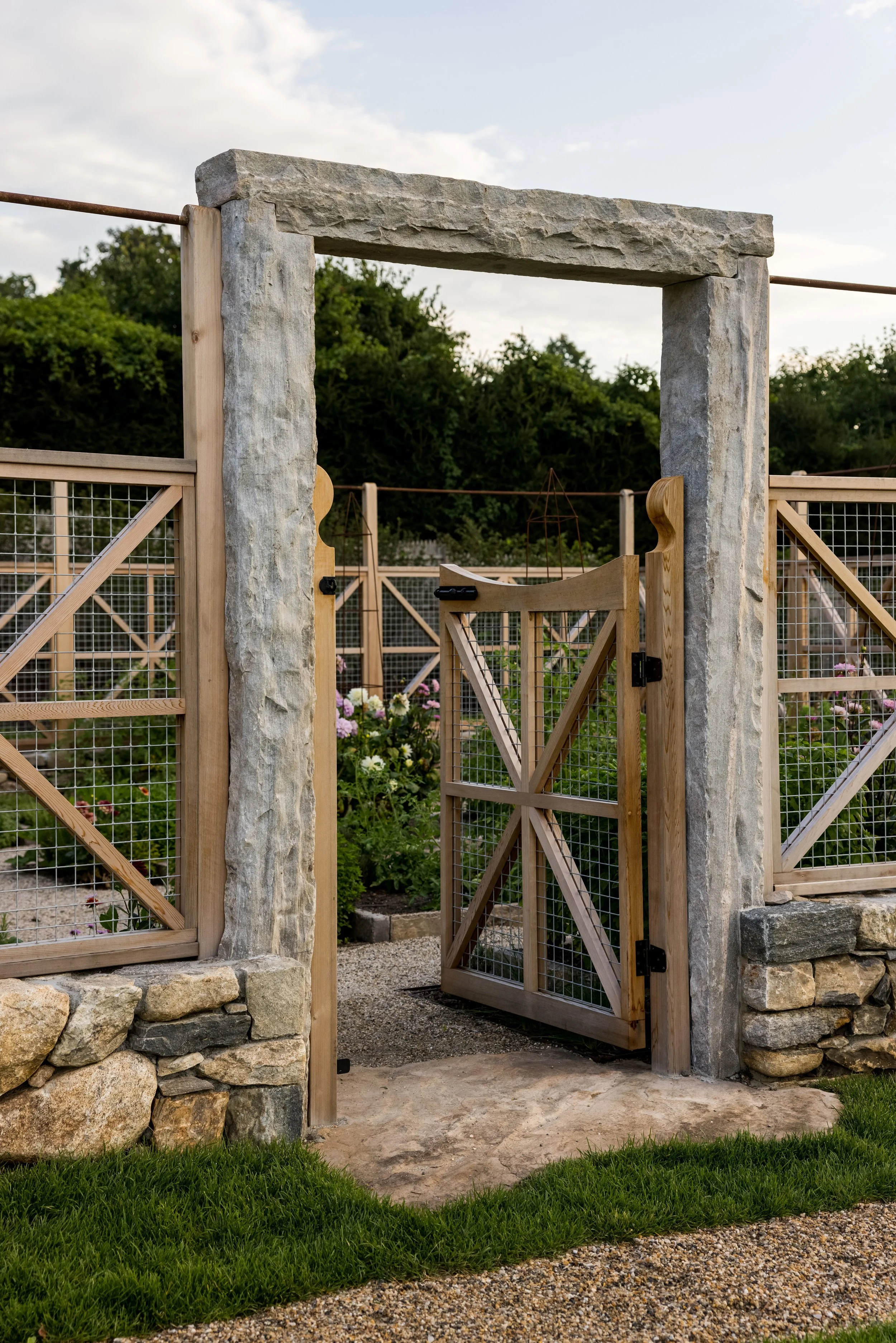 Formerly a mundane parking area, the space has been transformed into a captivating pool garden, offering panoramic views of the Sound. Our design ethos seamlessly integrates traditional and contemporary elements, notably showcased in creating a contemporary pool that captivates and invites visitors to the site’s optimal space for viewing Long Island Sound. Embracing a hands-on collaboration approach, we crafted a serene vegetable and cutting garden adorned with sculptural elements, enclosed by a decorative cedar fence. This space provides sanctuary and artistic expression, aligning perfectly with the current landscape trend of homesteading. Every detail, from the whimsical bronze lovebirds perched on the cedar fence to the meticulously curated plant selection, underscores our unwavering commitment to excellence.
