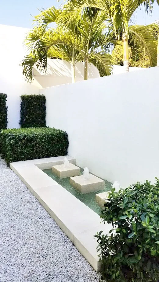 We were honored when an esteemed friend and interior designer asked us to design her private getaway home. This property has beautiful light, especially since it’s on the waterway and faces south. This modern house was designed with 11-foot ceilings and lots of glass and needed to be very connected to the outdoors. The exterior was treated as a seamless extension of the whole. On the front side there is a garden and fountains and on the other, the pool and the water. You get this breezy quality with everything revolving around the water. Elegant forms of clipped hedges and tall palm trees created the simplistic compliment to the architecture and the waterfront views.