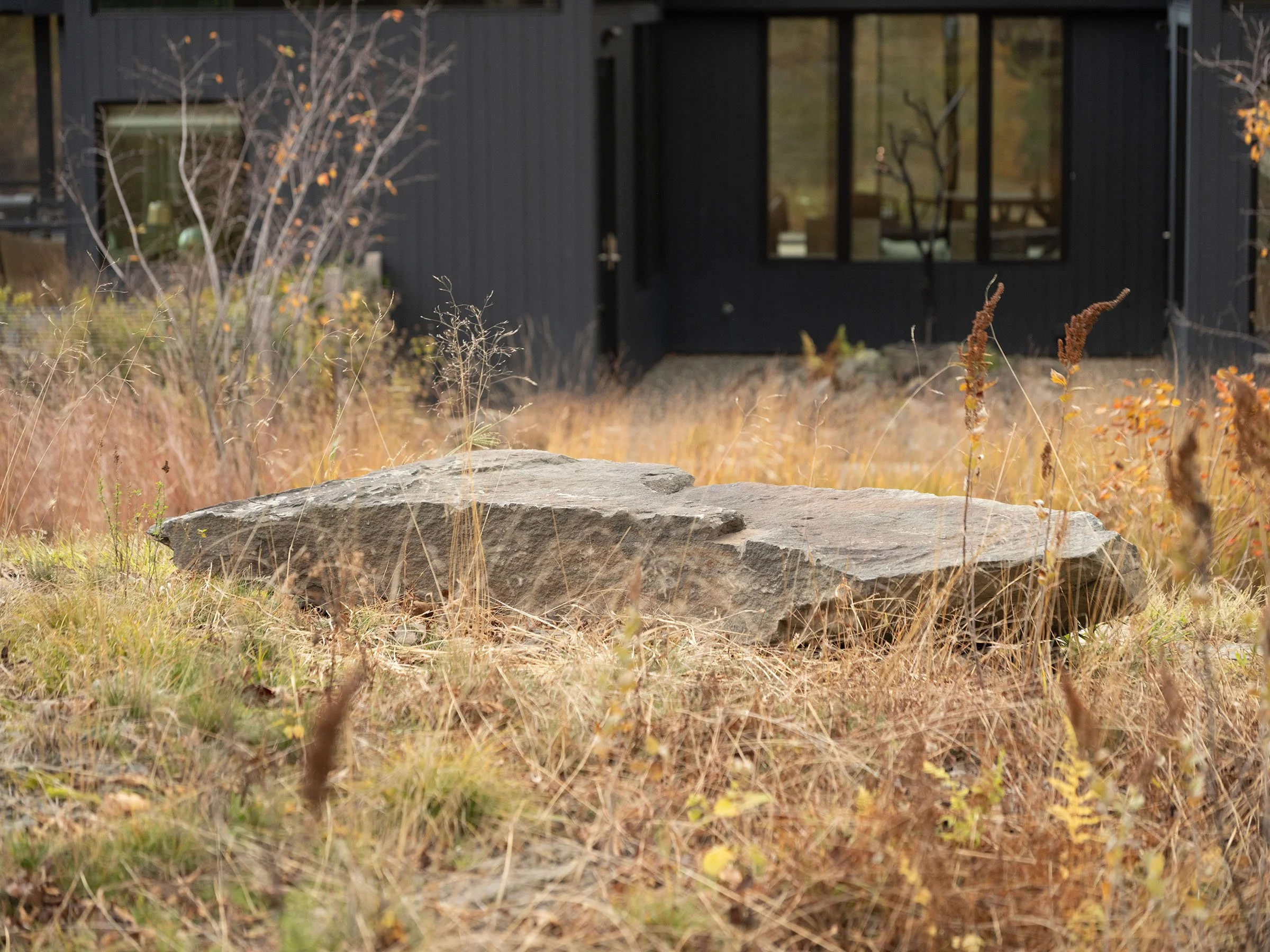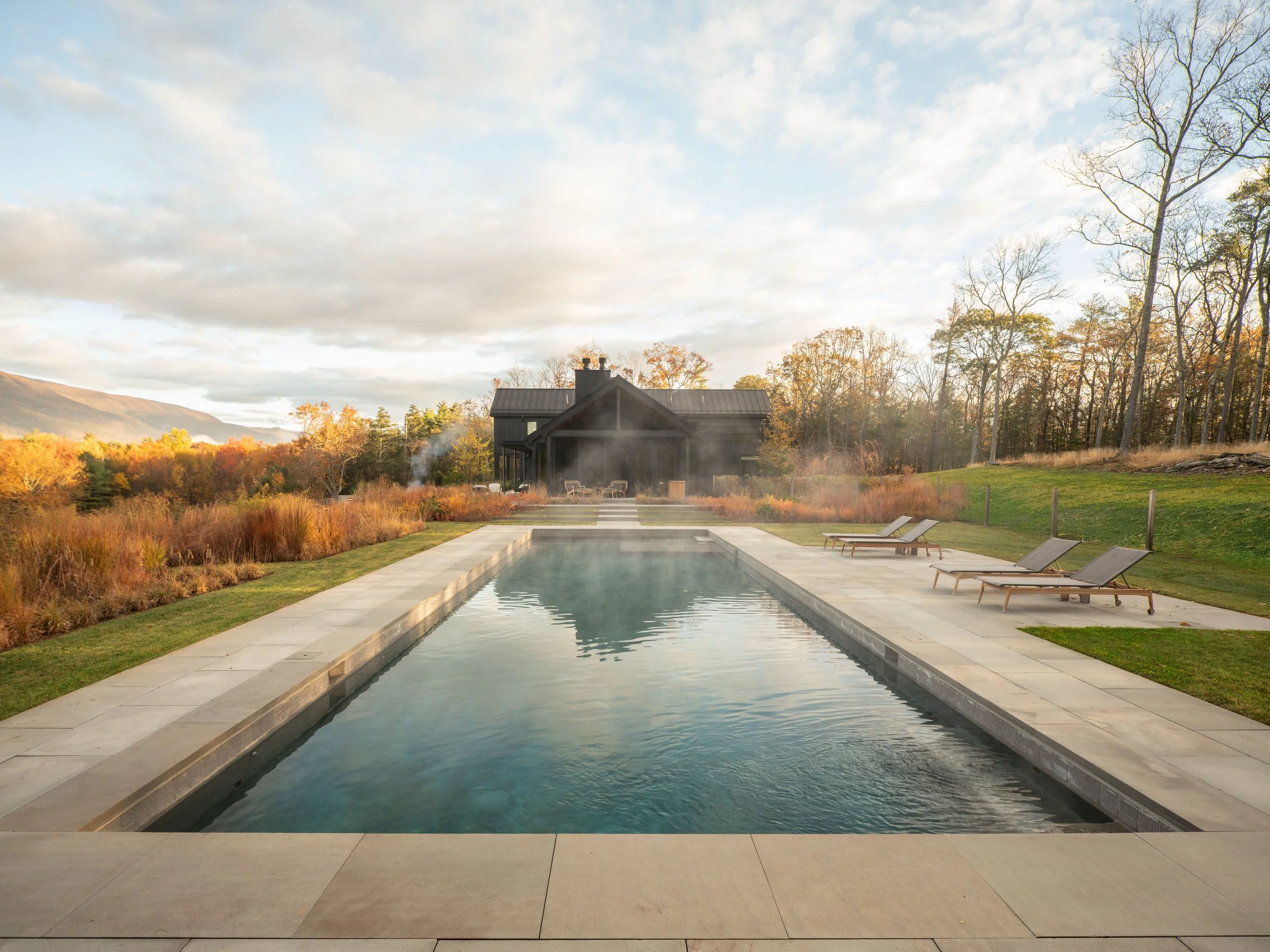 Set along a weathered ridge in the Catskills, the landscape takes its cues from the site’s former life as a bluestone quarry, allowing geology, topography, and long views to shape a design rooted in material honesty and spatial clarity. Stone sourced from the property was reintroduced as steps, benches, a sculptural garden, and a boulder-set fire pit, complemented by Corten steel and board-formed concrete to create a refined yet elemental architectural language. Positioned to frame expansive views across an open meadow and toward the distant mountains, trees and structural plantings establish a rhythm of enclosure and release, drawing the horizon into daily experience. Shallow, nutrient-poor soils informed a resilient palette of drought-tolerant native grasses, perennials, and canopy trees, with seeded meadows evolving over time to enrich both visual depth and ecological presence—shaping a series of quiet outdoor rooms defined by light, land, and the enduring character of the Catskills.